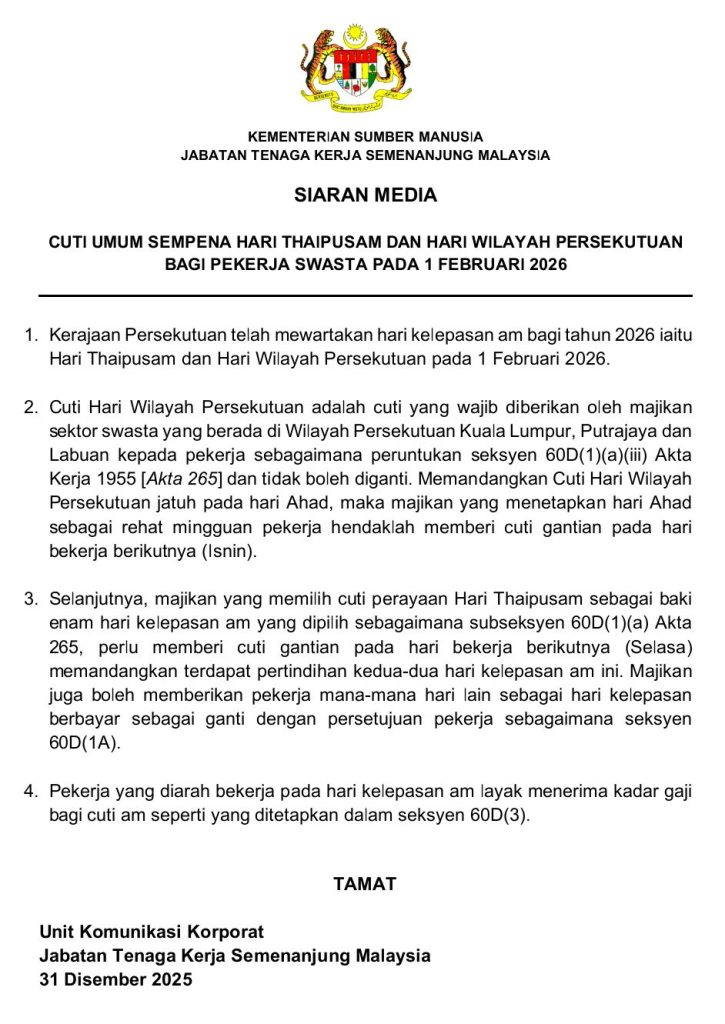 Kerajaan Persekutuan telah mewartakan Hari Thaipusam dan Hari Wilayah Persekutuan sebagai hari kelepasan am bagi 2026, yang masing-masing jatuh pada 1 Februari.